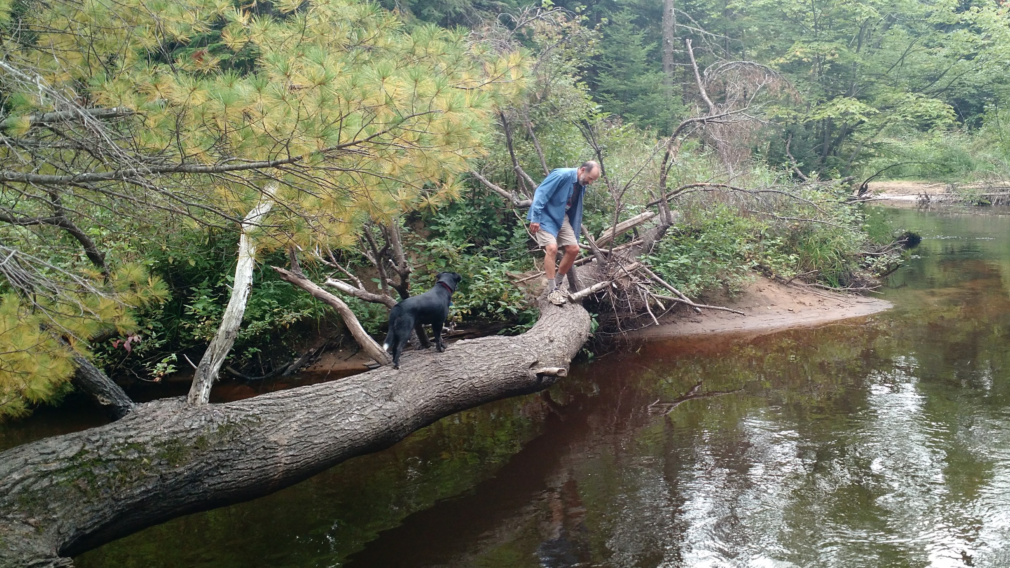 Nope, it is not Marta, she is a little silent star. The big silent star of this book is the huge white pine that blocked the river and required canoeists and kayakers to portage around the tree for the entire summer of 2017. This photo is on page 39, in Chapter 4. Power of the River – Erosion at Boggy’s Camp. The chapter summarizes our two decade work on the river bank to grow dogwood and other vegetation to stabilize the bank, and then the subsequent erosion caused by people dragging their boats around this tree. The following spring the high river flows dislodged the tree, which then ripped out a small white pine and much of our stabilized bank.